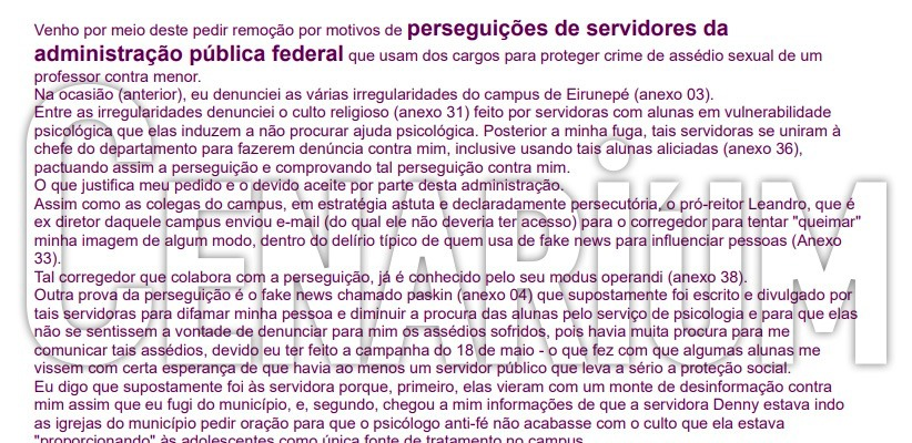 Outro servidor mencionado no material vazado é Leandro Amorim Damasceno. De acordo com o e-mail, o servidor seria suspeito para atuar em procedimentos que envolvessem o psicólogo e que ele chegou a ser citado por Isac Neto, professor denunciado à PF por assédio contra uma aluna, como alguém que protege assediadores no campus de Eirunepé (AM).