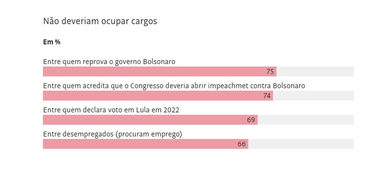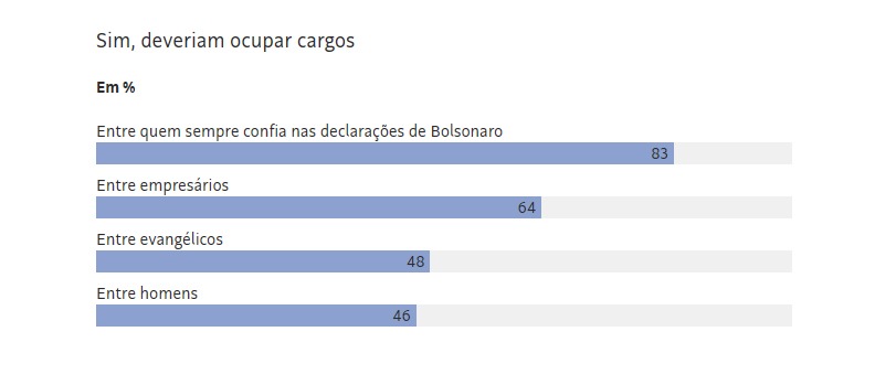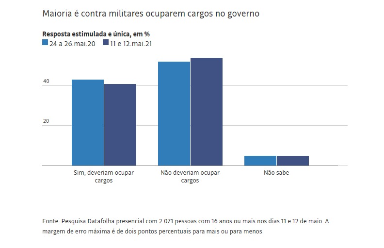 Um ano atrás, o instituto também fez esse questionamento, e a rejeição às nomeações também venceu: 52% se disseram contrários à presença dos militares no governo, ante 43% favoráveis.