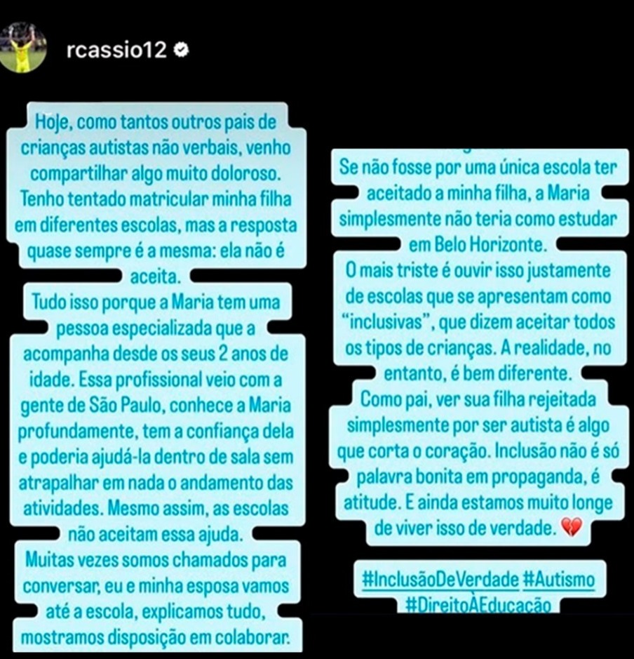 Em publicação feita na sexta-feira, 22, nas redes sociais, o jogador relatou que a filha é acompanhada por uma profissional desde pequena, que também se mudou para Belo Horizonte após sua transferência do Corinthians para o clube mineiro, em 2024. “Hoje, como tantos outros pais de crianças autistas não verbais, venho compartilhar algo muito doloroso. Tenho tentado matricular minha filha em diferentes escolas, mas a resposta quase sempre é a mesma: ela não é aceita”, escreveu.