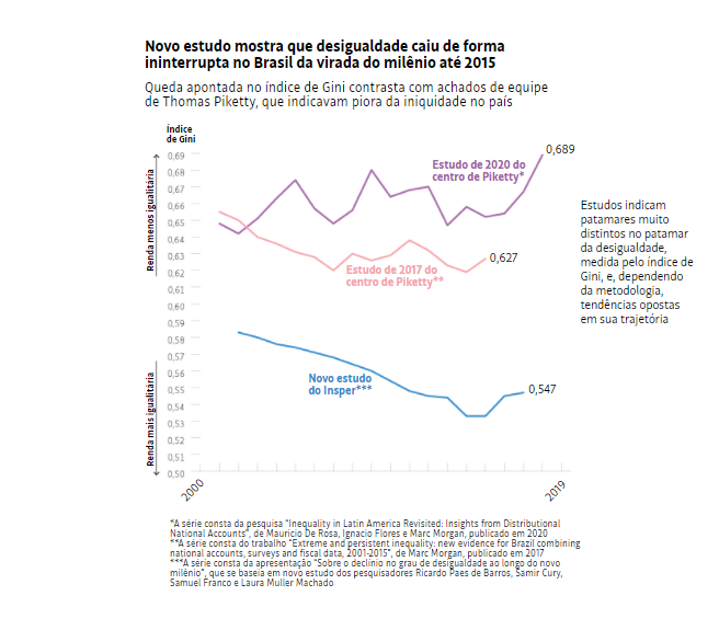 Em uma nota técnica publicada em dezembro de 2020, os pesquisadores Mauricio de Rosa, Ignacio Flores e Marc Morgan, do World Inequality Lab, centro fundado e codirigido pelo reputado economista francês Thomas Piketty, apresentaram cálculos novos que indicavam um aumento da concentração de renda brasileira.