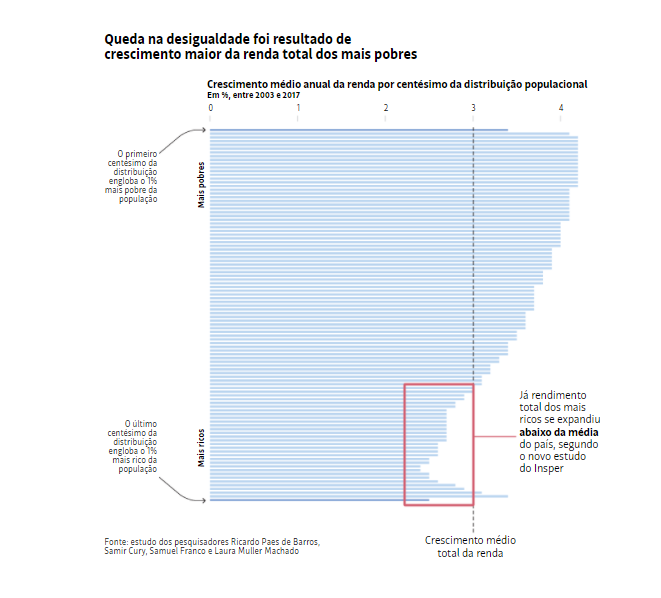 Os resultados do novo trabalho indicam que todas as fatias da população adulta brasileira — dividida em cem partes iguais, os chamados centésimos da distribuição — situadas abaixo dos 29% mais ricos tiveram crescimento em suas rendas anuais acima da média nacional de 3%, no período analisado.