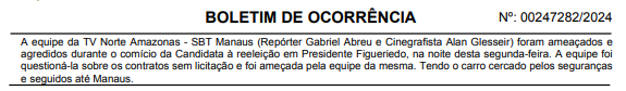 Após o ocorrido, o repórter registrou Boletim de Ocorrência contra a prefeita Patrícia Lopes, alegando ameaça. No registro policial, Gabriel relatou o fato ocorrido no município. “A equipe da TV Norte Amazonas – SBT Manaus (repórter Gabriel Abreu e cinegrafista Alan Geissler) foram ameaçados e agredidos durante o comício da candidata à reeleição em Presidente Figueiredo, na noite desta segunda-feira. A equipe foi questioná-la sobre os contratos sem licitação e foi ameaçada pela equipe da mesma, tendo o carro cercado pelos seguranças e seguidos até Manaus“, consta no documento.