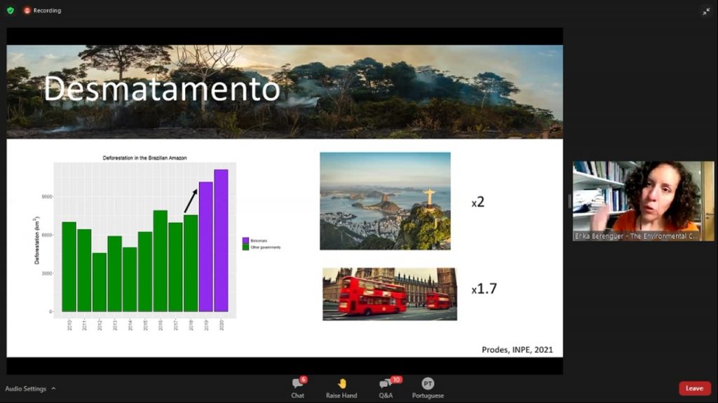 A pesquisadora associada ao Instituto de Mudanças Climáticas, Erika Berenguer, apresentou dados que apontam para o aumento de desmatamento, o que influi na emissão de gases do efeito estufa, redução de chuvas, prejuízos econômicos e na possibilidade de novas pandemias. Além disso, a cientista chamou a atenção para os cortes de investimento na ciência e como esse cenário pode ser revertido.