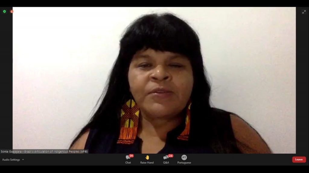 Em sua participação, a líder indígena brasileira e coordenadora da Articulação dos Povos Indígenas do Brasil (Apib), Sonia Guajajara, salientou os desafios enfrentados pelas comunidades indígenas, principalmente em tempos de pandemia. Guajajara afirmou que o enfrentamento dos indígenas não é de hoje, mas que se acirra de forma muito mais drástica no atual governo.