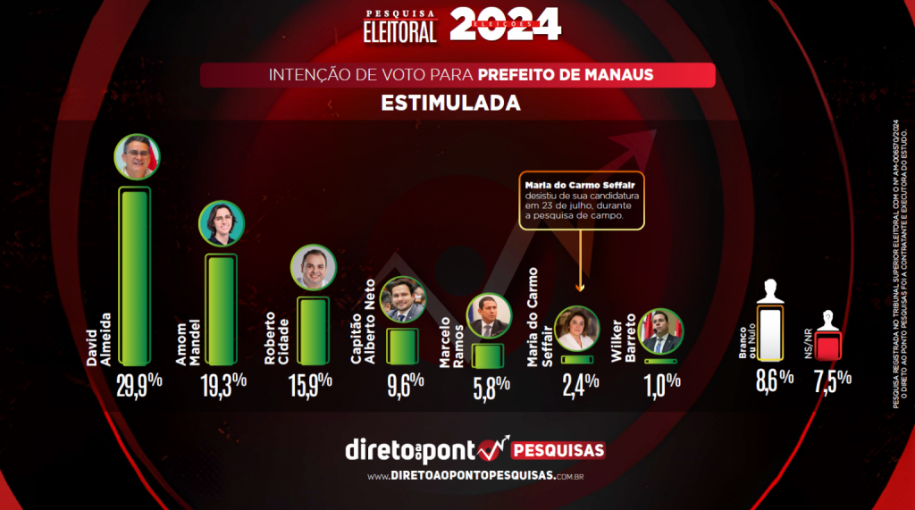 A pesquisa foi realizada de 21 a 24 de julho. Foram 830 entrevistas apenas com eleitores residentes no município de Manaus, no Amazonas. O levantamento foi registrado no Tribunal Superior Eleitoral (TSE) com o N° AM-006570/2024. Esta é a quarta pesquisa do Direto ao Ponto.