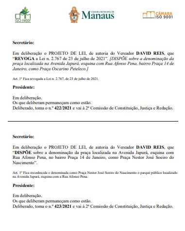Na mesma sessão ordinária, os vereadores deliberaram um Projeto de Lei (PL) que reconhece o nome do parque público como Nestor Nascimento, considerado um precursor de causas sociais voltadas para o movimento negro no Amazonas. As medidas, no entanto, ainda vão à 2ª Comissão de Constituição, Justiça e Redação (CCJ), onde devem ser analisadas e, posteriormente, passar por uma nova votação no Plenário da Casa Legislativa.