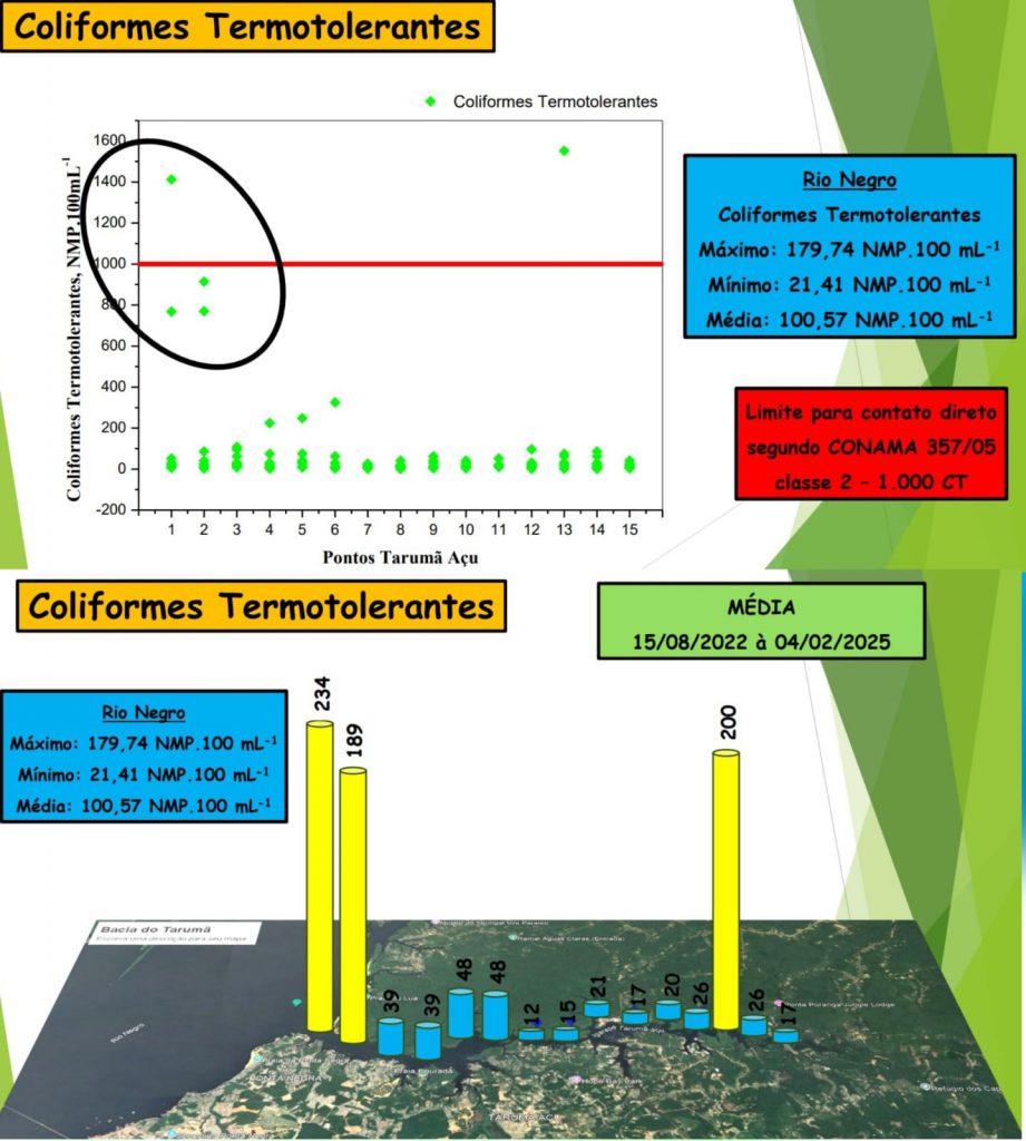 Apesar de a Bacia Tarumã-Açu estar dentro dos padrões de qualidade definidos pelo Conselho Nacional do Meio Ambiente (Conama), o monitoramento realizado durante três anos, em parceria com a Gerência de Recursos Hídricos do Instituto de Proteção Ambiental do Amazonas (Ipaam), revela uma tendência preocupante entre os 15 pontos de coleta de água analisados, com base nos nove parâmetros-chave escolhidos: pH, condutividade elétrica, coliformes termotolerantes, oxigênio dissolvido, nitrogênio amoniacal, fósforo total, demanda bioquímica de oxigênio (DBO₅), turbidez e sólidos dissolvidos totais.