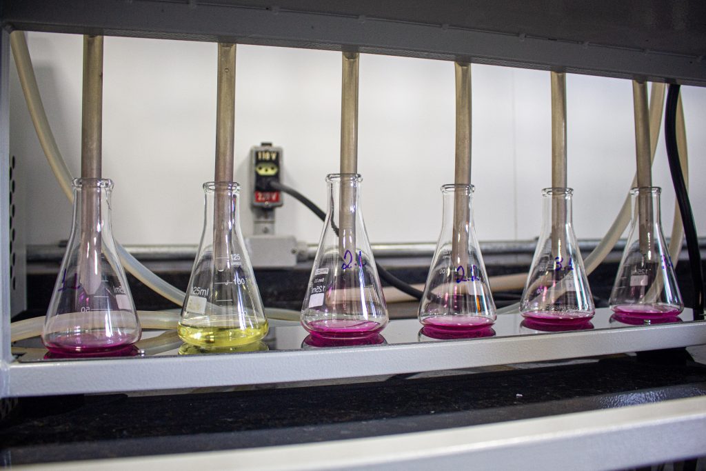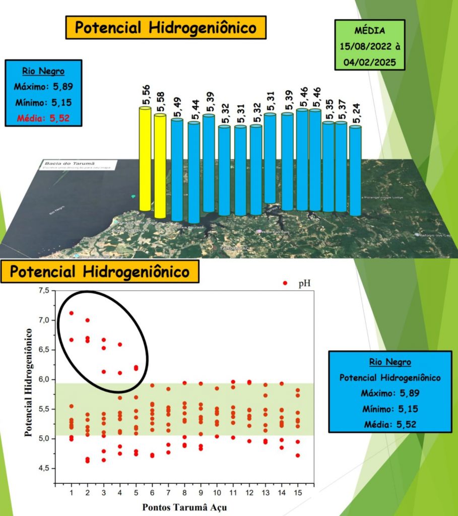 O pH da água do Tarumã-Açu se manteve dentro da média estabelecida pelo Conama, mas com grandes variações nos cinco primeiros pontos da bacia, com destaque para os pontos 1 e 2, onde a alteração da escala ultrapassa 7,0. O potencial hidrogeniônico (pH) é um dos principais alertas apontados na análise. A concentração de hidrônios, ou íons hidrogênio (H⁺), refere-se à acidez ou alcalinidade da água, medida em uma escala de 0 a 14. A Resolução nº 357 do Conama estabelece que, para a proteção da vida aquática, o pH deve estar entre 6,0 e 9,0.
