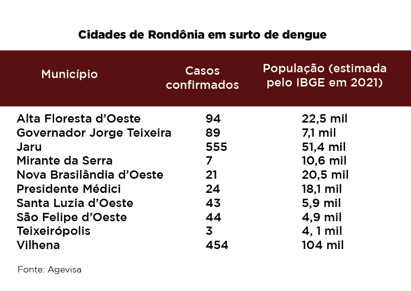 VILHENA (RO) – O alerta que reúne dados compilados desde o mês de julho deste ano, da Agência Estadual de Vigilância em Saúde (Agevisa), aponta que dez, dos 52 municípios de Rondônia, estão enfrentando surtos de dengue, doença que cresceu mais de 600% no Estado, em 2022.