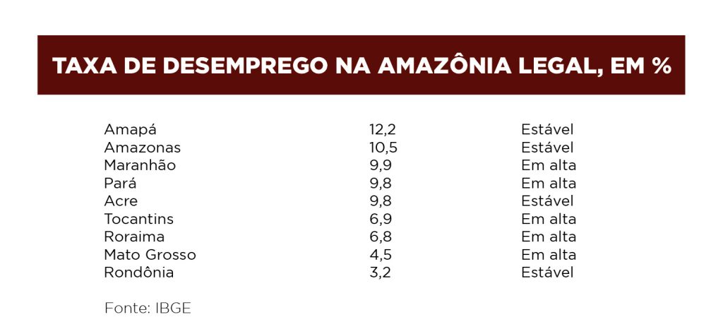 O IBGE considera a situação estável em todos os Estados que compreendem o território da Amazônia Legal. Entre as nove unidades da região, Amapá foi o Estado que mais registrou desemprego desde janeiro: 12,2%.