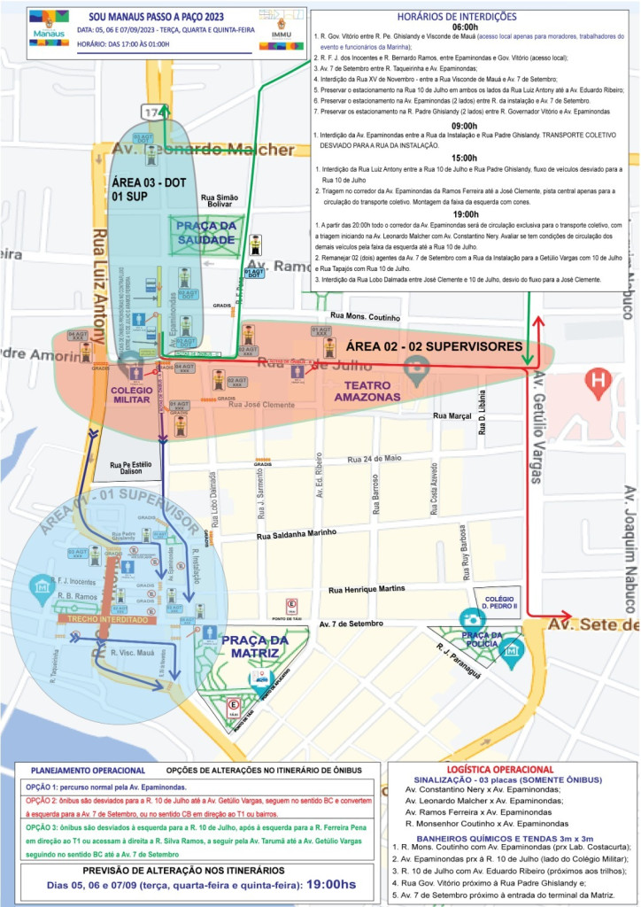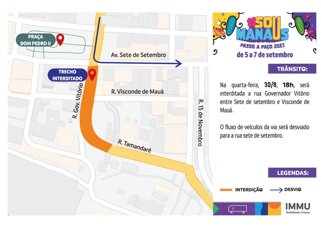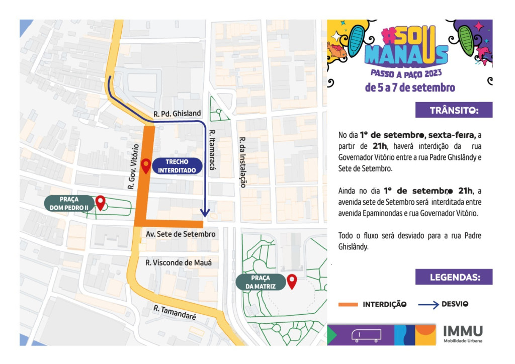 “O festival Sou Manaus Passo a Paço é um marco cultural para nossa cidade. Para garantir a segurança e fluidez do evento, o IMMU atuará ativamente nas interdições viárias. Pedimos a compreensão da população e reforçamos que as medidas são para que todos possam aproveitar com tranquilidade. Estamos trabalhando para que o trânsito flua e a festa seja um sucesso para todos”, disse o diretor-presidente do IMMU, Paulo Henrique Martins.