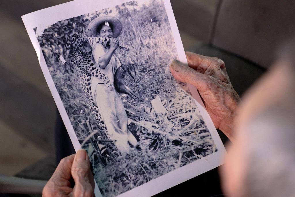 Ele mostra a foto de uma onça abatida perto de sua casa por um caçador japonês.