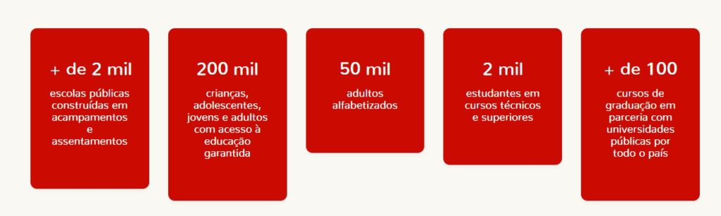 No site do MST, uma das áreas que se destaca é a educação, que desde a origem desenvolveu processos que incluem como prioridade a luta pela universalização do direito à escola pública e à qualidade social da infância, à universidade.