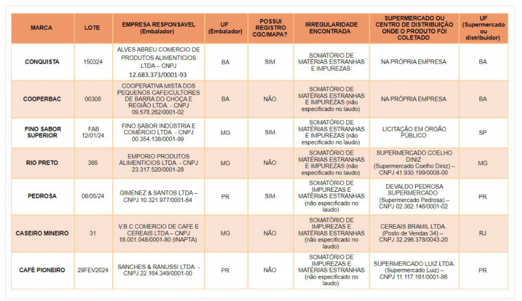 BRASÍLIA (DF) – O Ministério da Agricultura e Pecuária (Mapa) divulgou aos consumidores o alerta de risco de sete novas marcas e lotes de café torrado que foram desclassificadas após serem consideradas impróprias para o consumo.