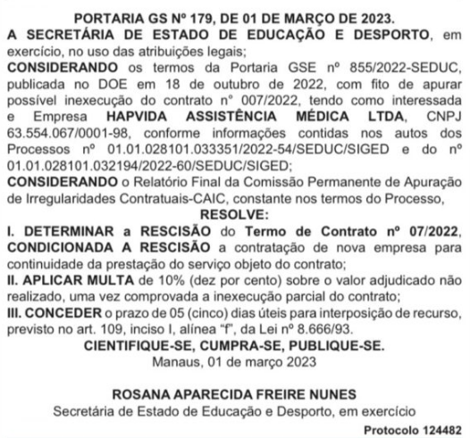Em 2022, a Hapvida teve contrato rescindido pelo governo do Estado por ineficiência no atendimento a servidores da Secretaria de Educação do Amazonas (Seduc/AM). O contrato 007/2022, de R$ 87 milhões, foi firmado para fornecer atendimento médico aos servidores da secretaria, na capital e no interior do Amazonas, que somavam, aproximadamente, 20 mil beneficiários.