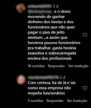 Na mesma publicação, uma mulher, que afirma ser ex-funcionária, afirma que o local sobrecarrega funcionários e paga um “salário miserável”, o que impacta prejudica os pacientes. “Consequentemente afeta no atendimento ao paciente“, escreveu. Em seguida, outra internauta reclama sobre a arrecadação de valores dos donos da empresa. “E o dono morrendo de ganhar dinheiro dos bestas“, escreveu.
