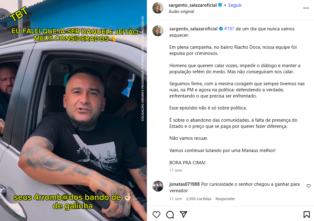 MANAUS (AM) – Vereador mais votado de Manaus (AM) nas eleições de 2024 e sargento da Polícia Militar do Amazonas (PM-AM), Alexandre da Silva Salazar, conhecido como Sargento Salazar (PL), responde a uma ação penal no Tribunal de Justiça do Amazonas (TJAM) por ter assassinado Felipe Kevin de Oliveira com seis disparos à queima-roupa, segundo denúncia do Ministério Público (MP-AM). O homicídio ocorreu na Zona Norte de Manaus, em junho de 2019, e o processo criminal aponta que o parlamentar colocou outras pessoas em risco ao disparar contra o homem em uma via pública.