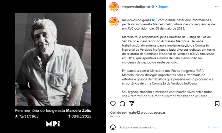Por meio da rede social Twitter, o Ministério dos Povos Indígenas pontuou que Marcelo Zelic iniciou diálogos importantes para a retomada de estudos e grupos de trabalhos que preservavam o processo e a importância de uma Comissão da Verdade Indígena. “Seu legado, trabalho e memória continuarão vivos entre todos nós e reforçamos que continuaremos trabalhando em suas ideias”, publicou a pasta.