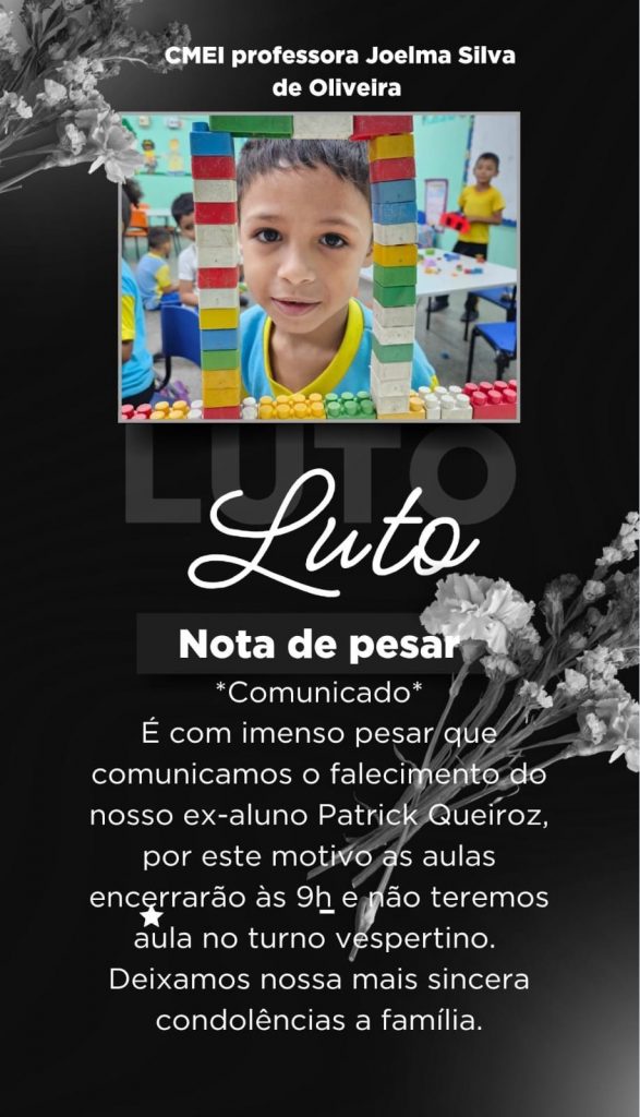 Nas redes sociais, o Centro Municipal de Educação Infantil (Cmei) Joelma Silva de Oliveira publicou nota de pesar sobre o falecimento de Patrick. “É com imenso pesar que comunicamos o falecimento do nosso ex-aluno Patrick Queiroz. Por este motivo, as aulas encerrarão às 9h e não teremos aula no turno vespertino. Deixamos nossas mais sinceras condolências com a família“, diz a nota.