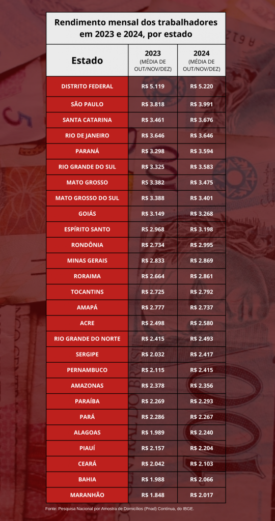 Os maiores rendimentos do País ficaram centralizados nas regiões Centro-Oeste, Sudeste e Sul, no Distrito Federal, São Paulo e Santa Catarina, respectivamente. No primeiro, a média de salário dos trabalhadores, nos últimos três meses de 2024, foi de R$ 5.220. No segundo, o rendimento foi de R$ 3.991 e, no terceiro, ficou em R$ 3.676.