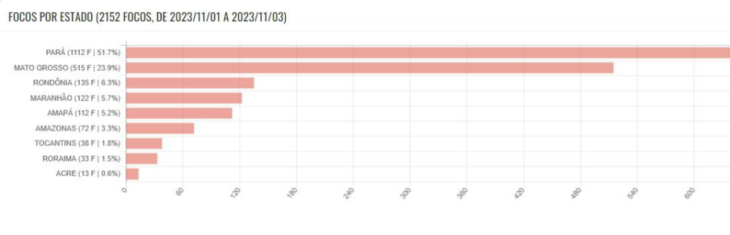 De acordo com o Inpe, de 26 de outubro até esta sexta-feira, 3, foram registrados 5.305 focos no Estado do Pará e, em menor intensidade, na Região Metropolitana de Manaus (RMM), onde, no mesmo período, foram registrados 149 focos.