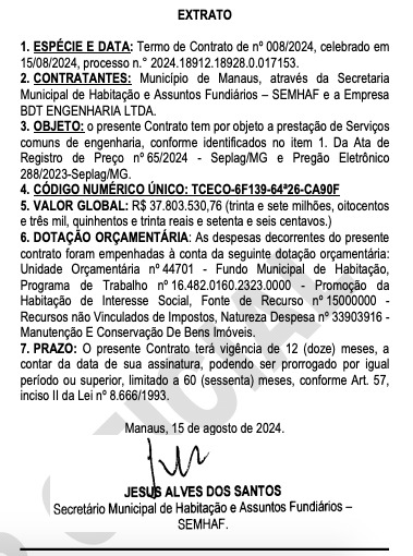 MANAUS (AM) – A Secretaria de Habitação e Assuntos Fundiários (Semhaf) da Prefeitura de Manaus, comandada por David Almeida (Avante), aderiu a uma Ata de Registro de Preços da Secretaria de Estado de Planejamento e Gestão de Minas Gerais (Seplag-MG) e dispensou licitação formal para firmar contrato com a empresa BDT Engenharia Ltda. por R$ 37,8 milhões.