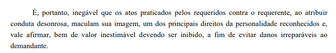 “Quanto ao perigo de dano ou o risco ao resultado útil do processo, evidencio que tais postagens/ publicações/ opiniões ocasionam violação aos direitos personalíssimos da honra e imagem antes mesmo de qualquer procedimento de apuração de responsabilidade penal, o que justifica a pronta intervenção em sede de tutela de urgência. É, portanto, inegável que os atos praticados pelos requeridos contra o requerente, ao atribuir conduta desonrosa, maculam sua imagem, um dos principais direitos da personalidade reconhecidos e, vale afirmar, bem de valor inestimável devendo ser inibido, a fim de evitar danos irreparáveis ao demandante”, diz trecho da decisão.