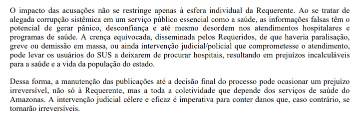 Para o magistrado, a manutenção das publicações “pode ocasionar um prejuízo irreversível, não só à requerente, mas a toda a coletividade que depende” dos serviços de saúde do Amazonas. A decisão aponta que a “intervenção judicial célere e eficaz é imperativa para conter danos que, caso contrário, se tornarão irreversíveis“.
