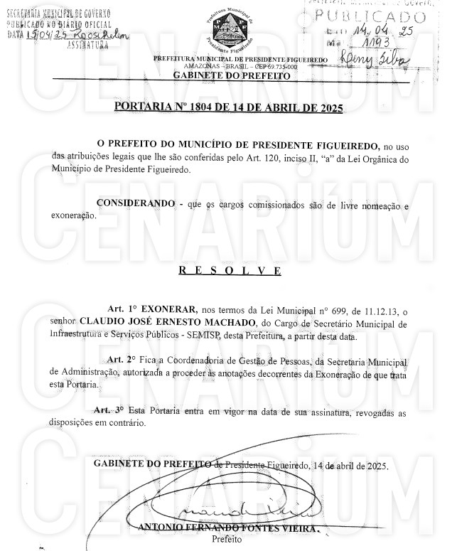 O documento, obtido com exclusividade pela CENARIUM, é assinado pelo prefeito do município, Antonio Fernando Fontes Vieira. “Os cargos comissionados são de livre nomeação e exoneração”, diz a Portaria 1804.