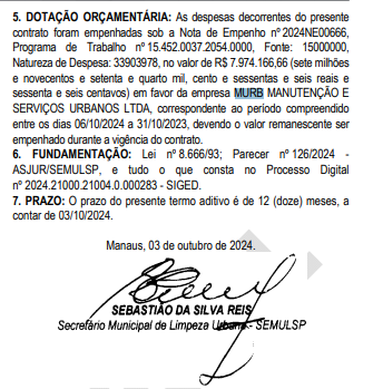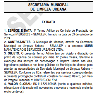 MANAUS (AM) – A Secretaria Municipal de Limpeza Urbana (Semulsp), da Prefeitura de Manaus, liderada por Sabá Reis, assinou um novo contrato no valor de R$ 114.827.999,88 com a empresa Murb Manutenção e Serviços Urbanos LTDA, que está sob investigação pela Polícia Federal (PF). O contrato foi oficializado no Diário Oficial do Município, em 31 de outubro.