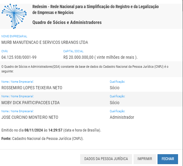 A empresa sob CNPJ de inscrição 04.125.938/0001-99, varia na distribuição de serviços como criação de bovinos para corte, comércio atacadista de cereais e leguminosas, representante de eletrodomésticos, têxteis, comércio de automóveis entre outros. José Curcino, presente no quadro societário da Murb, é dono da Construtora Rio Piorini, que realizou pagamentos que totalizam cerca de R$ 124 mil à sogra de David Almeida, a empresária Lidiane Fontenelle.