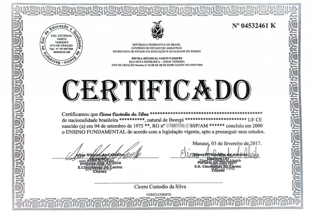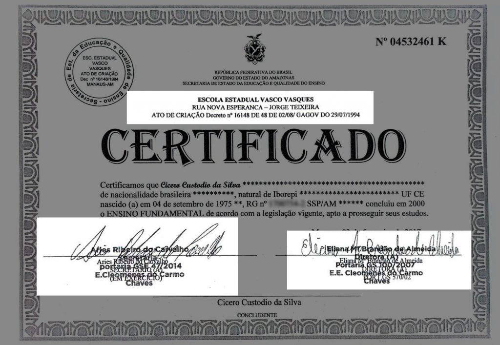 Além disso, ao analisar o último documento apresentado por Sassá da Construção Civil ao TRE-AM, a reportagem constatou que o certificado de conclusão do ensino fundamental dele contém informações contraditórias. O documento, emitido pela Escola Estadual Vasco Vasques, foi assinado por Eliana Maria Brandão de Almeida e Aries Ribeiro do Carvalho, gestora e secretária, respectivamente.