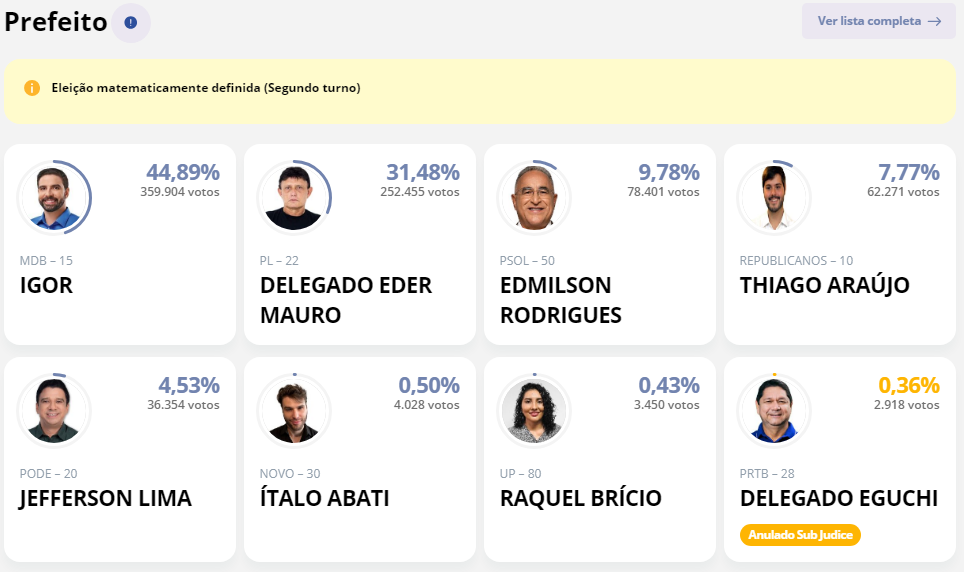 Igor Normando, candidato apoiado pelo governador Helder Barbalho (MDB), foi o mais votado no primeiro turno, conquistando 359.904 votos, o que representa 44,89% do total. Éder Mauro, aliado do ex-presidente Jair Bolsonaro (PL), garantiu a segunda posição com 252.455 votos, equivalendo a 31,48%. Com esses resultados, ambos seguem para o segundo turno, que ocorrerá no dia 27 de outubro.