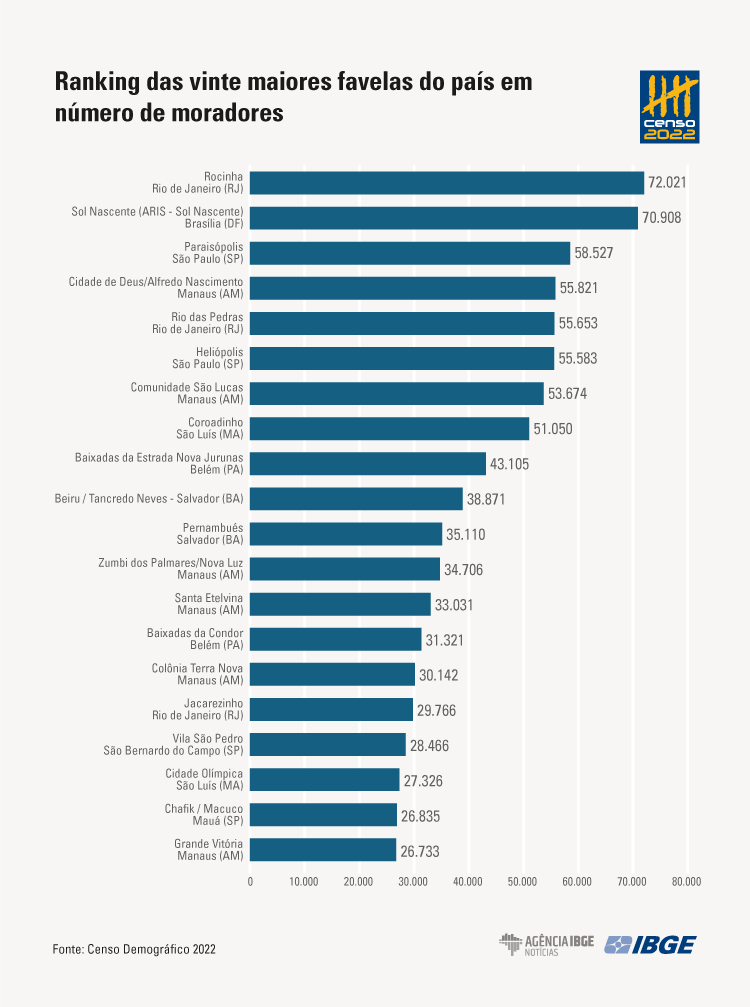 Dentre as 392 favelas e comunidades no País, as três maiores em número de habitantes estão em Manaus. Cidade de Deus e Alfredo Nascimento, na Zona Norte, somam 55.821 habitantes. A Comunidade São Lucas, no bairro Tancredo Neves, na Zona Leste, registrou 53.674 moradores. E o bairro Zumbi dos Palmares, também na Zona Leste, com 34.706 moradores.