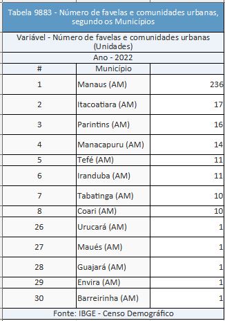 O Amazonas, em 2022, tinha 392 favelas e comunidades urbanas, sendo 236 favelas e comunidades em Manaus. Além da capital, os dados apontam que dos 62 municípios do Estado, 30 possui favelas e comunidades. Veja a lista: