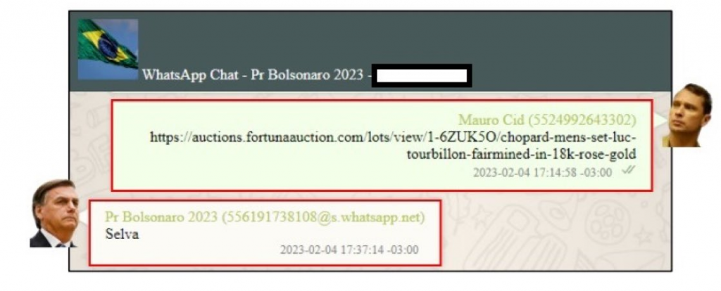 A polícia ainda acrescentou que, no dia do leilão do kit rosé, Cid enviou ao contato do ex-presidente um link da rede social Facebook que provavelmente seria de uma transmissão ao vivo dos leilões da empresa Fortuna Auction e escreveu “daqui a pouco é o kit”.