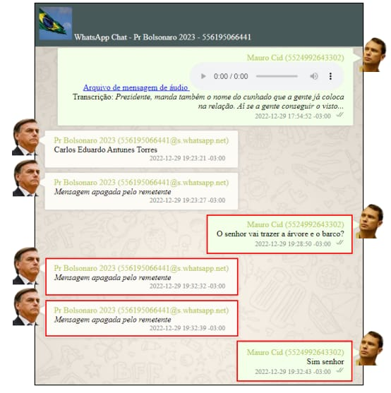 Bolsonaro envia duas mensagens, e as apaga na sequência. Cid responde: “Sim senhor”. O material seguiu para os EUA, onde Cid tentou negociar a venda de ambos.