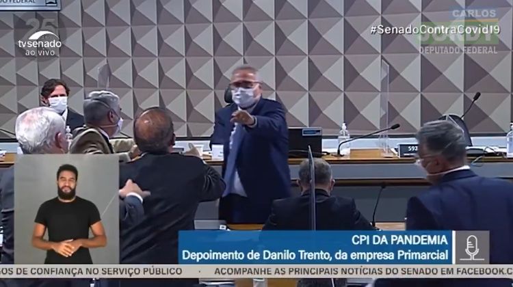 A confusão começou quando Jorginho interrompeu a fala de Renan para defender o presidente Jair Bolsonaro. Renan não gostou de ser interrompido e o clima esquentou.