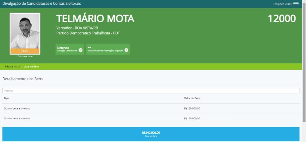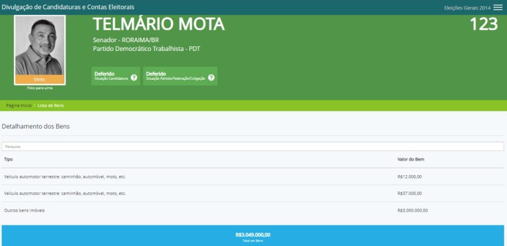 Nos anos seguintes em que Telmário Mota se candidatou (2012, 2014 e 2018), os valores se mantiveram abaixo dos R$ 4 milhões. Eleito senador há oito anos, ele declarou, na época, possuir bens que totalizavam R$ 3.049.000,00.