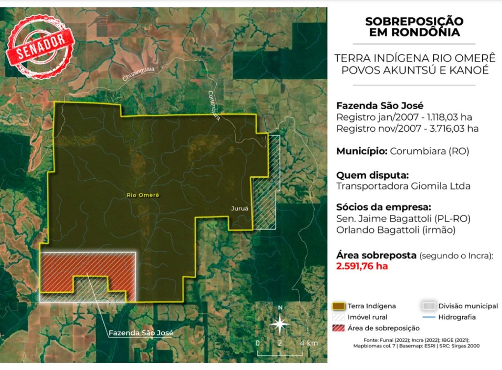 RONDÔNIA – O senador pró-garimpo de Rondônia, Jaime Bagattoli (PL), é apontado como proprietário de uma fazenda de criação de gado que sobrepõe a Terra Indígena (TI) Rio Omerê, localizada no município de Corumbiara, no interior do Estado.