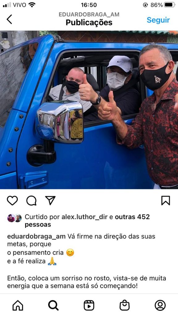 Na publicação, Eduardo Braga escreveu uma mensagem motivacional: “Vá firme na direção das suas metas, porque o pensamento cria e a fé realiza. Então, coloca um sorriso no rosto, vista-se de muita energia que a semana está só começando!”.