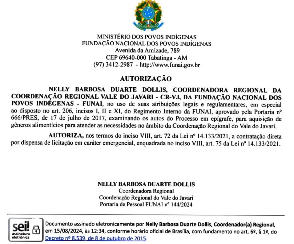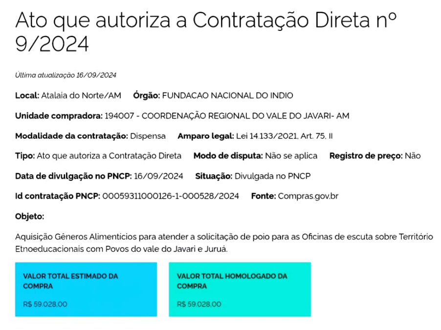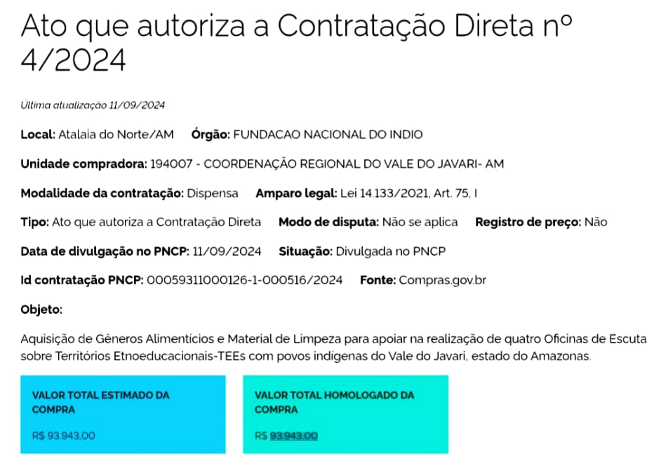 No primeiro ato de autorização de contratação direta, ou seja, dispensando o processo de licitação para fornecer o produto, a empresa de Robert Miguel Vargas Ramos garantiu R$ 93,9 mil para o fornecimento de alimentos e material de limpeza “para apoiar na realização de quatro Oficinas de Escuta sobre Territórios Etnoeducacionais (TEEs) com povos indígenas do Vale do Javari”. Entre os produtos, constam no documento carne bovina, açúcar e café. Veja documento: