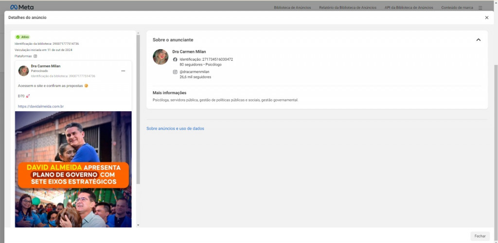 A publicação foi impulsionada como anúncio pago nas plataformas Facebook e Instagram e foi identificada na biblioteca de anúncios do Meta, empresa responsável pela gestão dessas redes sociais. Na legenda da publicação, a servidora escreveu: “Acessem o site e confiram as propostas, D70”, acompanhado de um link que direcionava ao site oficial da campanha de David Almeida.