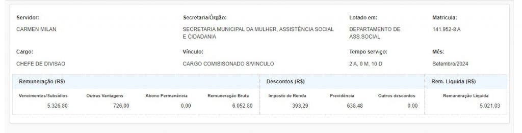 Carmen Milan é psicóloga e servidora municipal comissionada — indicada por livre nomeação, sem concurso público — que atua como chefe de divisão no Departamento de Assistência Social da Semasc, ganhando um salário de R$ 5 mil, de acordo com consulta no Portal da Transparência de Manaus.