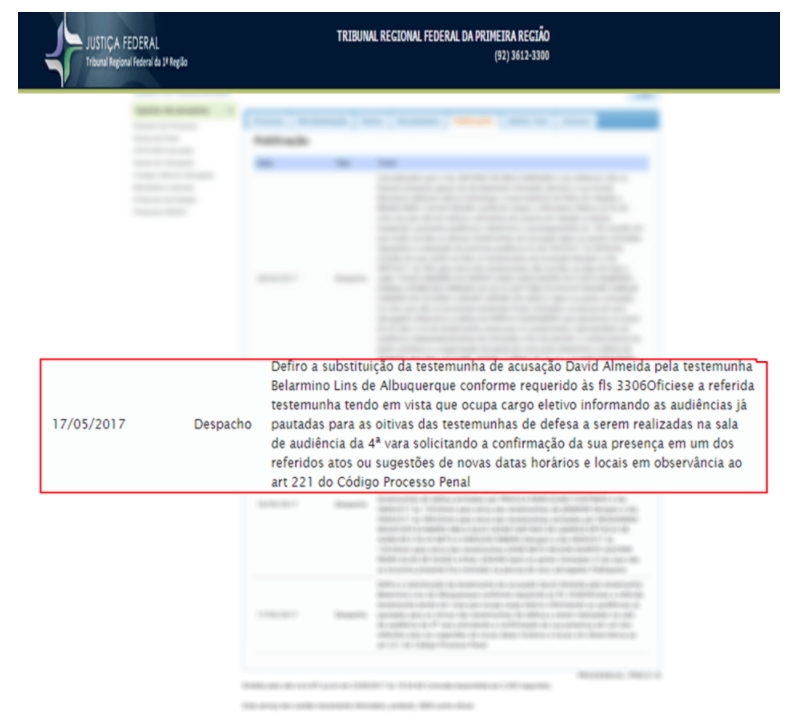 David Almeida não compareceu à audiência com Marcolino e nem explicou publicamente de forma concreta, na ocasião, porque foi chamado pela gerente de Moustafa para depor. Ele foi substituído pela própria gerente de Moustafa pelo deputado estadual Belarmino Lins (Progressista), conforme descrição do sistema da Justiça Federal abaixo:
