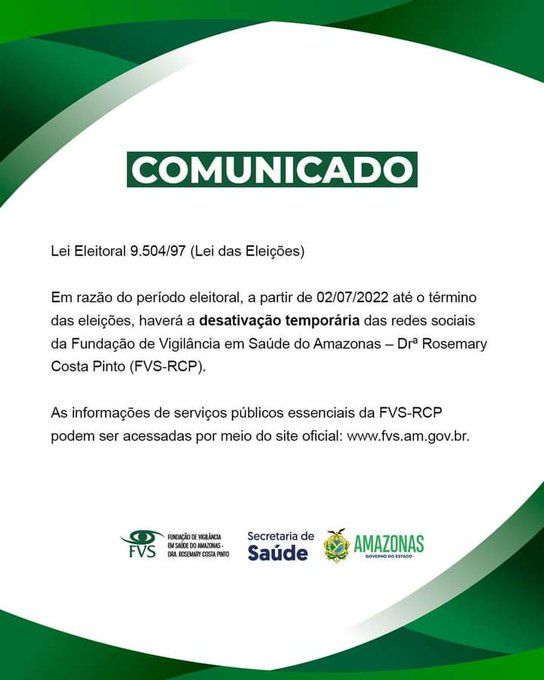 “Em razão do período eleitoral, a partir de 2/6/2022 até o término das eleições, haverá a desativação temporária das redes sociais da Fundação de Vigilância em Saúde do Amazonas – Drª Rosemary Costa Pinto (FVS-RCP)”, o comunicado disse ainda que “as informações de serviço públicos essenciais da FVS-RCP podem ser acessadas por meio do site oficial”, completou.