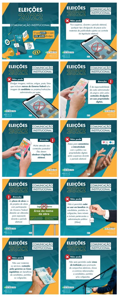 A comunicação das universidades e institutos federais também seguirá a norma. A Universidade Federal do Amazonas (Ufam) está efetuando, em sua página na web, a divulgação de uma série de cards com mensagens que avisam sobre a proibição de materiais que, supostamente, podem promover campanhas políticas.