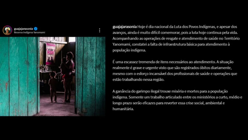 Em publicação em seu perfil no Instagram, a ministra Sonia Guajajara relata sobre a dificuldade de celebrar uma data como a de hoje. “Apesar dos avanços, ainda é muito difícil comemorar, pois a luta hoje continua pela vida. Acompanhando as operações de resgate e atendimento de saúde no Território Yanomami, constatei a falta de infraestrutura básica para atendimento à população indígena“, escreveu.