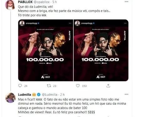 Em resposta ao fã e a Snoop Dogg, Lud não pesou o clima. “Não fica [com dó]. O fato de eu não estar em uma simples foto não me diminui em nada. Sério mesmo! Eu tô muito feliz, um hit que saiu da minha cabeça e ganhou o mundo acabou de bater 100 milhões de views! Real. Eu tô feliz pra c*ralho!”, escreveu ela, acrescentando cifrões.