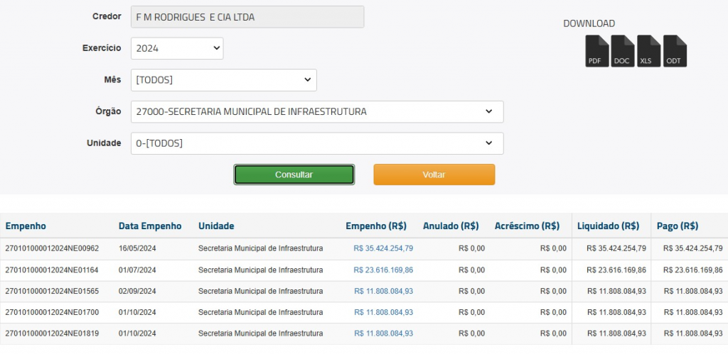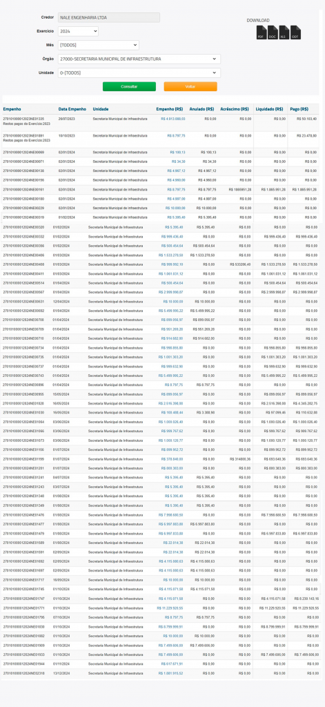 O montante de R$ 6 milhões foi empenhado em 2 de janeiro e é referente à 1ª medição do 3° termo aditivo do contrato 039/2022, firmado entre a empresa e a Seminf, e prevê os serviços de recuperação viária da área do bairro Alvorada 2, localizado na Zona Centro-Oeste da capital. Veja: